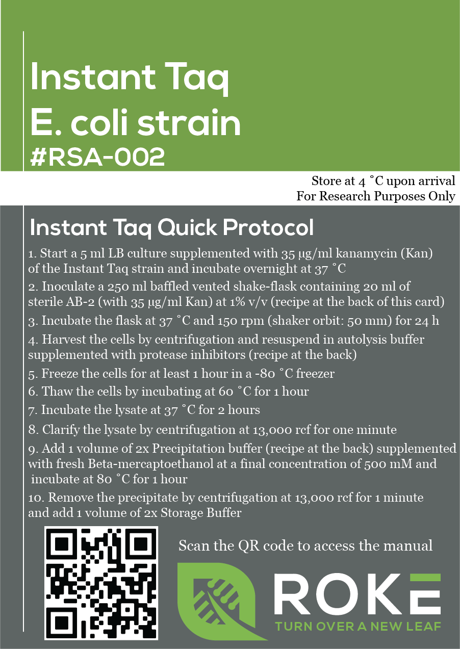 This is a genetically modified E. coli strain engineered to enable the easy expression and purification of Taq DNA Polymerase. Our approach combines protein autoinduction, equipment-free lysis and chromatography-free purification to yield high-quality DIY Polymerase, equivalent to commercially available enzymes. The strain comes with a control strain producing visible mCherry enabling rapid troubleshooting of expression and purification.